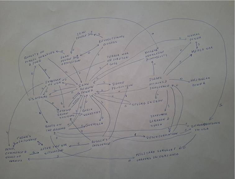 Une première boucle importante pourrait être l’influence des États-Unis qui renforce l’opposition des 80 % de la population iranienne. Ceux-ci souhaitent eux-mêmes exercer une forte pression sur la qualité des services publics et de l’approvisionnement alimentaire. Cependant l’influence des États-Unis au niveau diplomatique s’affaiblit par manque de crédibilité. Ceci fait que les États-Unis augmentent leurs attaques ce qui réduit les possibilités de services publics. En conséquence, le pouvoir du régime iranien grandit car ceci affaiblit l’opposition et réduit l’influence des États-Unis. C’est pourquoi les attaques des États-Unis doivent être encore intensifiées. Cette combinaison est aussi auto-renforcée car les États-Unis tentent de renforcer leur influence par leurs attaques afin de pouvoir réduire leurs attaques à cause d’une position d’influence renforcée par la suite.
